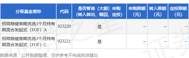 证券之星消息,11月11日招商基金管理有限公司发布《关于暂停招商稳健策略优选3个月持有期混合型 发起式基金中基金(FOF)申购(含定期定额投资)业务的公告》。公告中提示,为保障基金的平稳运 作,维护基金份额持有人利益,自2025年11月12日起暂停招商稳健策略优选3个月持有期混合型发起式 基金中基金(FOF)申购(含定期定额投资)业务,下属分级基金调整明细如下: | 分级基金简称 | 代码 | 是否暂停(大额)申购 | 申购限额 转入限额 定投限额 | | | --- | --- | --- | --- | --- | | | | (转入转出、赎回、定投) | (元) (元) | (元) | | 招商稳健策略优选3个月持有 期混合发起式(FOF) A | 023220 | 를 | | | | 招商稳健策略优选3个月持有 期混合发起式(FOF) C | 023221 | 를 | | | 以上内容为证券之星据公开信息整理,由AI算法生成(网信算备310104345710301240019号),不构成 投资建议。 ...