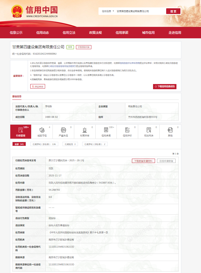 近日,信用中国公示了甘肃第四建设集团有限责任公司的行政处罚决定。行政处罚决定书文号苏宁江宁 建执罚决﹝2025﹞20-1号显示,甘肃第四建设集团有限责任公司违法事实为投标人相互串通投标。 依据《中华人民共和国招标投标法实施条例》第六十七条第一款,南京市江宁区城乡建设局对其作出罚 款542887.93元处罚。 其官网显示,甘肃第四建设集团有限责任公司注册资本3亿元,企业总资产120亿元,现隶属于甘肃省建 设投资(控股)集团有限公司,是具有国家建筑工程施工总承包特级资质、工程设计建筑行业甲级资质、 市政公用工程施工总承包壹级、机电工程施工总承包壹级资质的大型综合国有企业。 ...