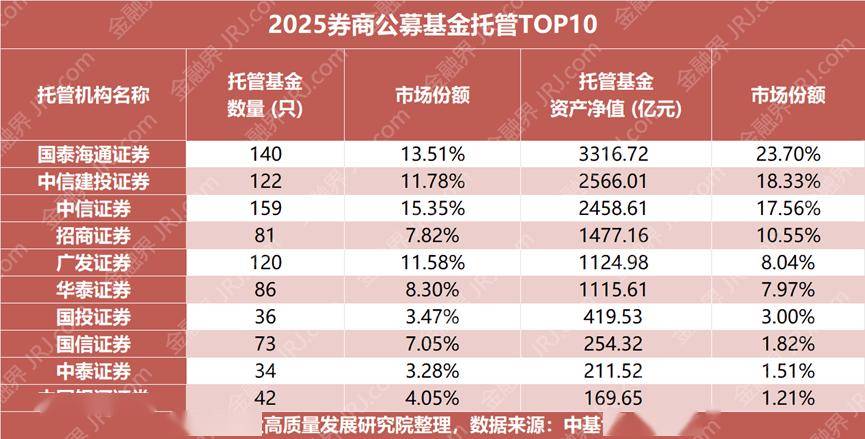 最新发布的2025年券商基金托管数据,揭示了一场无声却激烈的市场份额争夺战。 在公募领域,传统霸主银行虽仍占据绝对主导,但券商正以迅猛姿态从其传统领地中"虎口夺食",在私募托管领域,头部 券商正试图构筑更高的行业壁垒。 "虎口夺食"争公募 据Wind数据,截至2025年末,全市场公募基金托管总规模攀升至37.68万亿元。银行机构以84%的市场份额把控着大局,但 券商阵营15%的占有率背后,是近年来持续且强劲的扩张势头。 券商与银行在产品战场上的分野日益清晰。券商依托其强大的研究能力和资本市场纽带,在权益类基金,尤其是ETF等工 具化产品上建立了显著优势。相反,银行则凭借庞大的客户网络与稳健的渠道,在货币基金、债券型基金及传统主动管理 型产品上坚守阵地。这种错位竞争格局正在重塑托管市场的生态。 | | | 2025券商公募基金托管TOP10 | | | | --- | --- | --- | --- | --- | | 128 83 | 新書館 | | 北京国际 | | | 因 。 酒 通 正 等 | 140 | 13.51% | 3316.72 | 23.70% | | 中信建投证券 | 122 | 11.7 ...