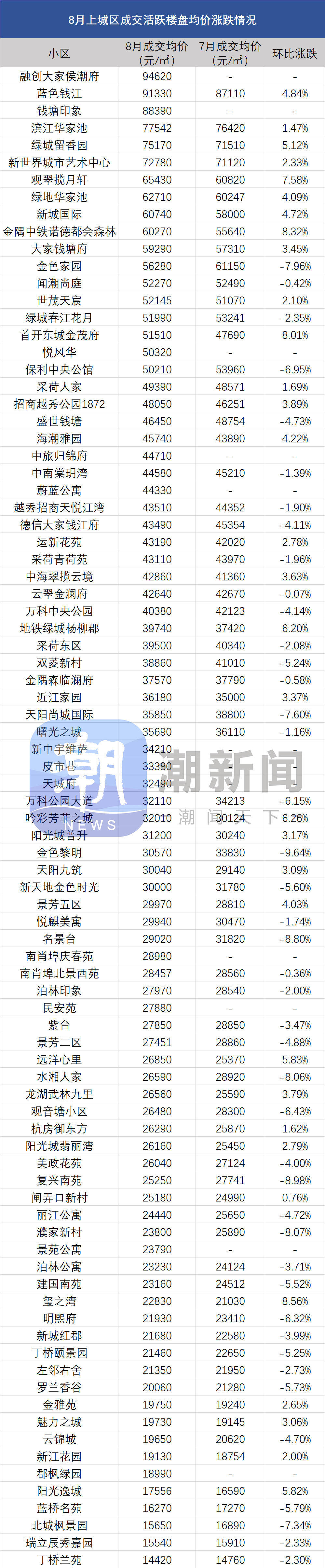 潮新闻客户端 记者 武恒光 黄磊 8月,杭州二手房市场表现相对稳定,尽管成交量连月下滑,但房价呈现企稳态势。杭州贝壳研究院数据显示,8月二手房住宅网签均价28178元/㎡,环比微 涨0.2%,同比上涨2.0%。 | 蓝桥名苑 | 16270 | 17270 | -5.79% | | --- | --- | --- | --- | | 北城枫景园 | 15650 | 16890 | -7.34% | | 瑞立辰秀嘉园 | 15540 | 15910 | -2.33% | | 丁桥兰苑 | 14420 | 14760 | -2.30% | 拱墅 | | 8月拱墅区成交活跃楼盘均价涨跌情况 | | | | --- | --- | --- | --- | | 八区 | 8月成交均价 | 7月成交均价 | 环比涨跌 | | | ( 7 . / m ) | ( 7 . / m ) | | | 云河宸元 | 73720 | 69190 | 6.55% | | 融创宜和园 | 69980 | | | | 滨江锦绣之城 | 68690 | 69134 | -0.64% | | 天阳武林邸 | 67541 | 69600 | - ...