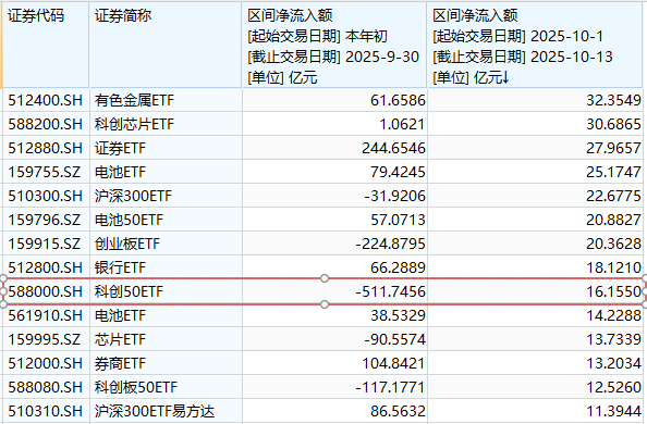 Core Viewpoint - Despite recent market volatility, certain equity ETFs have seen significant capital inflows, indicating investor confidence in specific sectors such as technology and materials [1][2]. Group 1: ETF Performance - As of October 13, 2023, the top-performing ETFs by net inflow include the following: - Non-ferrous Metals ETF with a net inflow of 3.235 billion - Sci-Tech Chip ETF with a net inflow of 3.069 billion, a significant increase from just 0.106 billion in the first nine months of the year - Securities ETF with a net inflow of 2.797 billion [2][3]. - A total of 14 equity ETFs have recorded net inflows exceeding 1 billion this month, with industry-themed ETFs being particularly favored [3][4]. Group 2: Market Trends - The market has shown a "buy the dip" mentality, particularly in growth sectors like chips and large-cap stocks, while investors have reduced positions in previously high-performing sectors [1][2]. - The recent adjustments in the market have provided an opportunity for investors to re-enter positions in the Sci-Tech 50 index, which had previously seen a significant rise of over 50% year-to-date [5][6]. Group 3: Future Outlook - The technology sector remains a focal point for investors, with expectations of continued growth driven by advancements in AI and semiconductor technologies [6][7]. - Foreign investment interest in China's technology sector is increasing, with a focus on electric vehicles, batteries, and robotics, suggesting a strengthening of China's tech ecosystem [7].