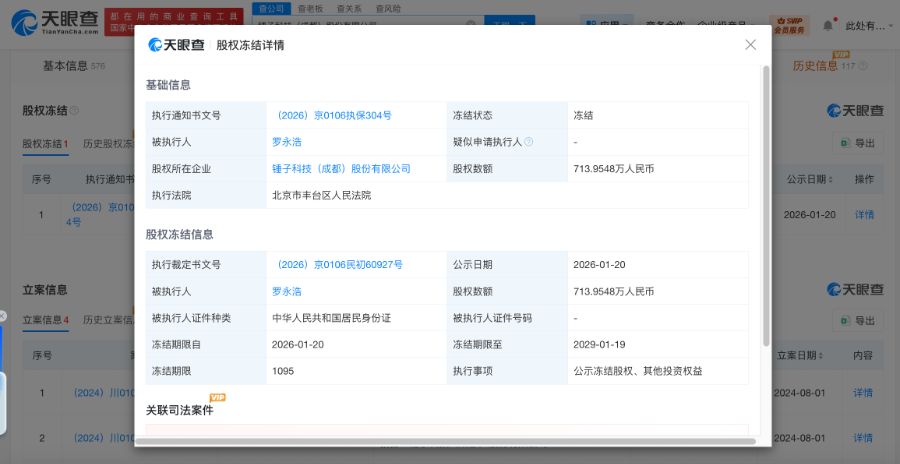 罗永浩被冻结713万股权