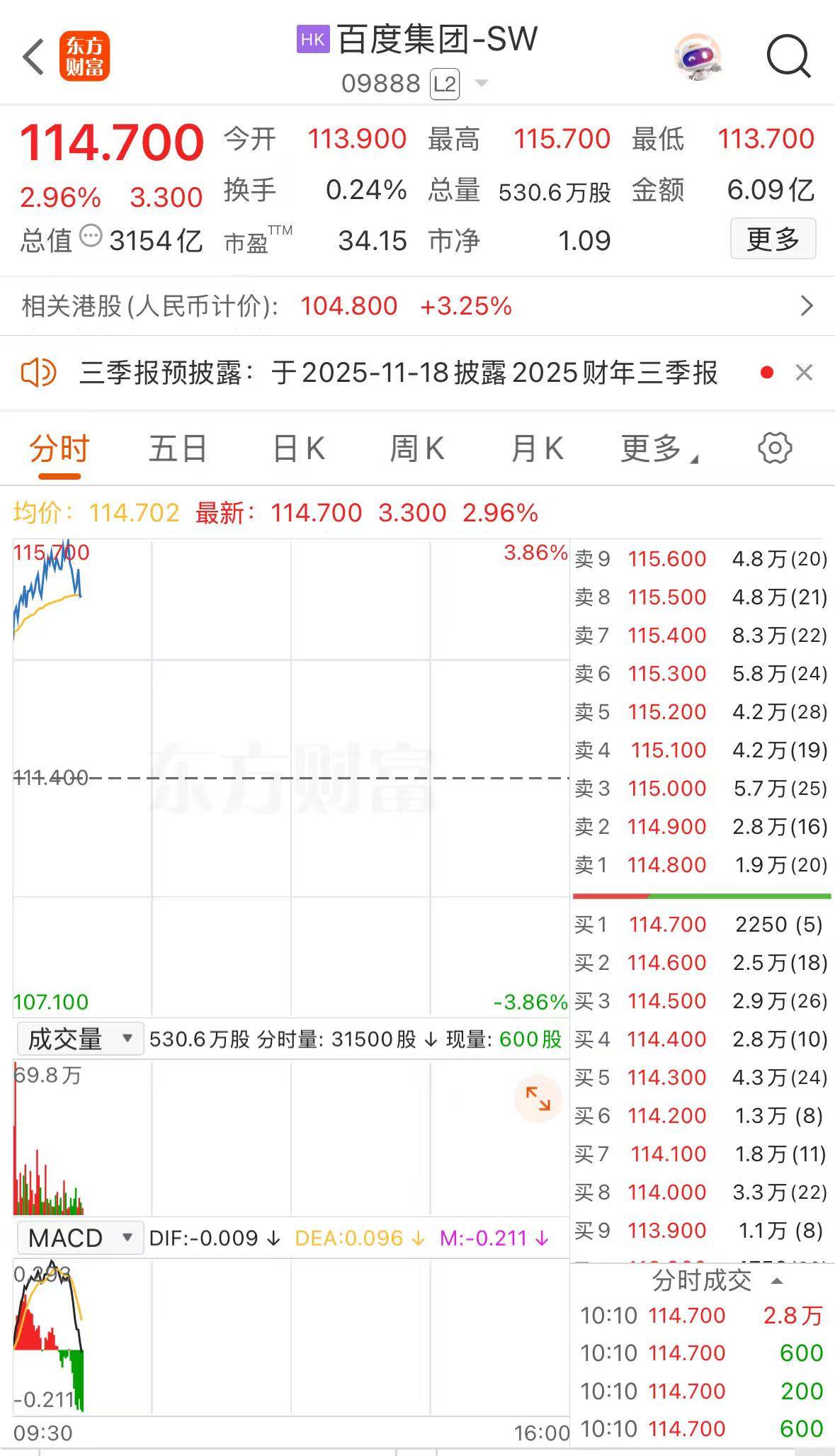 | 69.8万 | | 买5 114.300 | | 4.37 | | --- | --- | --- | --- | --- | | | | 买6 114.200 | | 1.37 | | | | 27 | 114.100 | 1.8 7 | | | | 买8 114.000 | | 3.37 | | MACD > | DIF :- 0.009 ↓ DEA: 0.096 ↓ M :- 0.211 ↓ | ¥9 113.900 | | 1.17 | | 0,263 | | 分时成交 · | | | | | | 10:10 114.700 | | 2 | | | | 10:10 114.700 | | | | -0.211 | | 10:10 114.700 | | | | 09:30 | | 16:00 10:10 114.700 | | | 消息面上,百度昨晚公布业绩,第三季度公司实现总营收312亿元,核心收入247亿元,均超市场预期。百度此次的业绩亮点还在于,首次披露的AI业务收 入约100亿元,同比增长超50%,超市场预期。 11月19日,百度集团-SW高开2.24%,报113.9港元/股。截至10时1 ...
