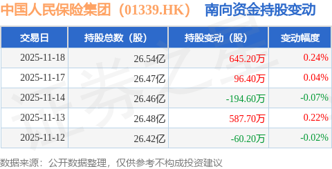 证券之星消息,11月18日南向资金增持645.2万股中国人民保险集团(01339.HK)。近5个交易日中,获 南向资金增持的有3天,累计净增持1074.5万股。近20个交易日中,获南向资金减持的有11天,累计净 减持1360.0万股。截至目前,南向资金持有中国人民保险集团(01339.HK)26.54亿股,占公司已发行 普通股的30.4%。 | 交易日 | 持股总数(股) | 持股变动(股) | 变动幅度 | | --- | --- | --- | --- | | 2025-11-18 | 26.54亿 | 645.20万 | 0.24% | | 2025-11-17 | 26.47亿 | 96.40万 | 0.04% | | 2025-11-14 | 26.46亿 | -194.60万 | -0.07% | | 2025-11-13 | 26.48亿 | 587.70万 | 0.22% | | 2025-11-12 | 26.42亿 | -60.20万 | -0.02% | 中国人民保险集团股份有限公司是一家主要提供保险产品的控股公司。该公司及其子公司主要从事财产 保险、健康保险、人寿保险、再保险、香港保险 ...