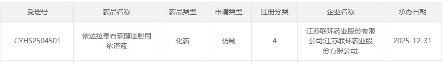 2025年12月31日,据国家药监局药品审评中心(CDE)官网显示,江苏联环药业提交的4类仿制药"依达拉奉右莰醇注射用浓溶液"上市申请已获受理。这是 继2025年11月14日上海凯宝新谊(新乡)药业申报失败后,该品种迎来的最新入局者。 | CYHS2504501 | 依达拉奉右药醇注射用 浓溶液 | 化药 | 仿制 | 4 | 江苏联环药业股份有限 公司江苏联环药业股 | 2025-12-31 | | --- | --- | --- | --- | --- | --- | --- | | 受理号 | 药品名称 | 药品类型 | 申请类型 | 注册分类 | 企业名称 份有限公司; | 承办日期 | 截图来源:CDE 依达拉奉右莰醇注射用浓溶液作为脑卒中治疗领域的重要品种,随着人口老龄化加剧和脑卒中发病率上升,市场需求将持续增长。原研产品进入医保后,患 者可及性大幅提升,为仿制药上市后的市场放量奠定了基础。 截至目前,江苏联环药业有44个品种获批并通过一致性评价,其中盐酸多西环素片、盐酸屈他维林注射液、盐酸屈他维林片、盐酸舍曲林胶囊4款为首家过 | (5 | | --- | | 24 13 7 12 34 A P ...