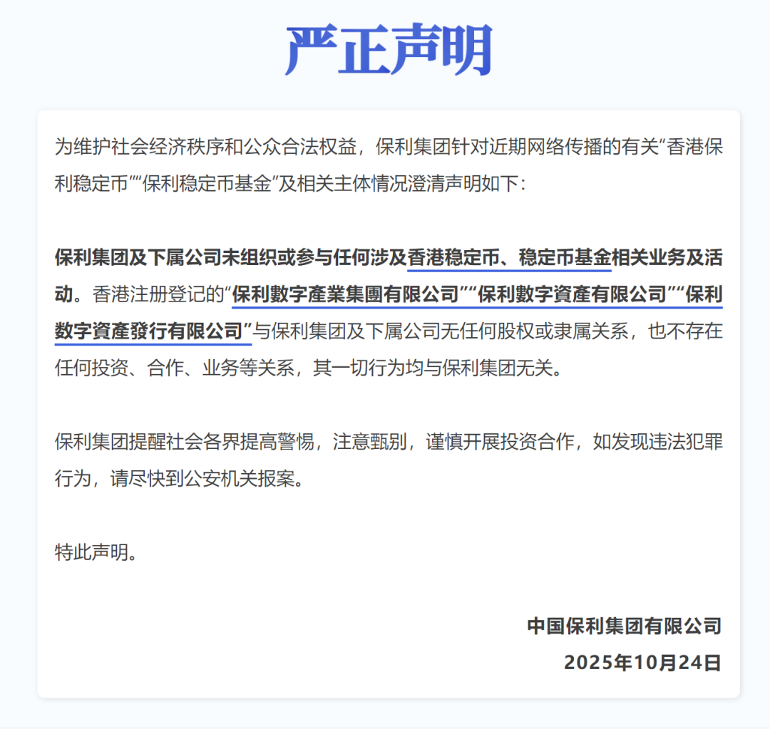 Group 1 - China Poly Group Corporation issued a statement clarifying that it has no involvement in any activities related to "Hong Kong Poly Stablecoin" or "Poly Stablecoin Fund" [1] - The companies registered in Hong Kong, such as "Poly Digital Industry Group Co., Ltd." and "Poly Digital Asset Issuance Co., Ltd.", have no equity or affiliation with Poly Group and are not involved in any investment or business relationships with it [1] - Poly Group urges the public to be vigilant and cautious in investment collaborations and to report any illegal activities to the police [1] Group 2 - Poly Group is a large central enterprise approved by the State Council and directly managed by the State-owned Assets Supervision and Administration Commission, established 40 years ago [4] - The company has developed a diversified business system known as "5+1", covering various sectors including trade, real estate, culture, technology, engineering, and finance, with operations in over 100 cities in China and nearly 100 countries globally [4] - Poly Group ranks 173rd in the 2024 Fortune Global 500 and has received an A grade in performance assessment from the State-owned Assets Supervision and Administration Commission 13 times [4] - The company has 10 main subsidiaries, employs 90,000 staff, and has 5 publicly listed companies [4]