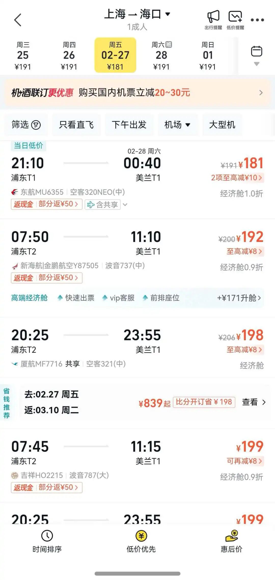 节后出行机票大跳水了,上海到海口三亚的机票都不到200元了。 | ■■奥一奥上 | | | | | | --- | --- | --- | --- | --- | | 1成人 | | | | | | 周三 周四 周五 | | 周六 班 | 周日 | | | 25 26 02-27 | | 28 | 01 | | | ¥191 $181 | ¥191 | ¥191 | ¥191 | | | 机酒联订更优惠 购买国内机票立减20~30元 | | | | | | 筛选(1) 下午出发 机场▼ | 只看直飞 | | | 大型机 | | ヨ日低价 | | 02-28 周六 | | | | 21:10 | | 00:40 | | X101X 101 | | 浦东T1 | | 美兰T1 | | 2项至高减¥10> | | 《 东航MU6355 空客320NEO(中) | | | | 经济舱1.0折 | | 返现金 部分返¥50 > > 部状化公 | | | | | | 07:50 | | 11:10 | | ¥200 ¥192 | | 浦东T2 | | 美兰T1 | | 至高减¥8 > | | > 新海航 金鹏航空Y875 ...