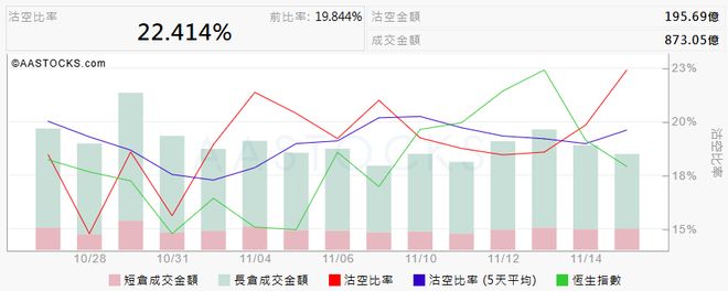 来源:智通财经 智通财经11月18日讯(编辑 胡家荣)近日港股市场持续震荡,同时市场卖空动作同样活跃。根据相关 数据统计,恒生指数的卖空比率从10月28日的14.78%升至11月17日的22.41%。 卖空活跃度显著上升 科技股成为重灾区 这一现象不仅体现在大盘指数上,更在个别明星股上表现得尤为突出。 腾讯的卖空比例从10月28日的11.49%上升至11月17日的13.98%,其卖空股数在11月14日更是达到362.84 万股,创下10月30日以来新高。 | 日期: | 周末总服本(万服) | 区间货空中显 | | 未零仓卖空调末值 | | | | 区间空层 | | 歷史版 酸/成交 :: | | --- | --- | --- | --- | --- | --- | --- | --- | --- | --- | --- | | | | 类空酸酸(万酸): | 含额(万元) : | 酸酸(万般): | 含额(万元): | 胶盘价(元): | 改良幅 : | 成交量(万服): | 雕交搬(万元): | | | 2025-11-17 | 914,477,00 | 192.85 | 122,847.79 | יי ...