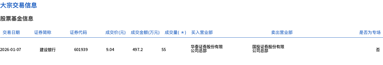 1月7日,建设银行大宗交易成交55万股,成交额497.2万元,占当日总成交额的0.41%,成交价9.04元,较市场收盘价9.04元持平。 | 交易日期 | 证券简称 | 证券代码 | 成交价(元) 成交金额(万元) 成交量( * ) 买入营业部 | | | 卖出营业部 | | --- | --- | --- | --- | --- | --- | --- | | 2026-01-07 | 建设银行 | 601939 | 9.04 497.2 55 | 华泰证券股份有限 公司总部 | 国投证券股份有限 公司总部 | | ...