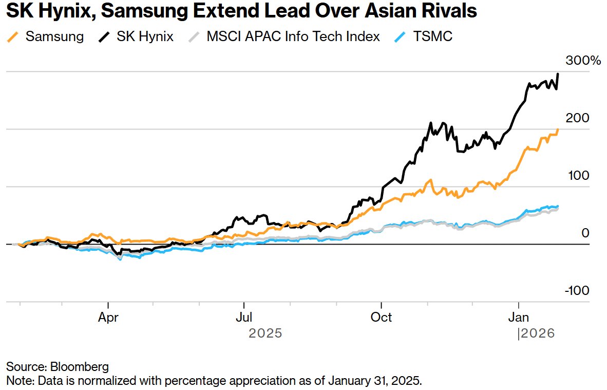 Group 1 - Samsung Electronics and SK Hynix released their earnings reports on the same day, highlighting the intense competition in the AI storage chip market [1] - The demand for high-performance memory driven by AI servers and data centers is expected to lead to a surge in memory prices across the electronics industry [1] - Samsung's stock has surged approximately 130% since early September, while SK Hynix's stock has roughly quadrupled, reflecting the industry's profitability [1] Group 2 - Samsung aims to catch up with SK Hynix in the high-bandwidth memory (HBM) sector, which is crucial for AI accelerators, by developing its next-generation HBM4 [3] - Analysts predict that SK Hynix's operating profit for Q4 will double to a record 16.6 trillion KRW (approximately $11.5 billion), driven by its dominance in the advanced HBM3E version [6] - Citigroup analysts forecast a 120% increase in average DRAM prices and a 90% increase in NAND prices this year, leading to target price increases for both SK Hynix and Samsung [9]
