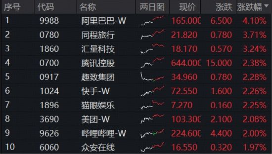 Core Viewpoint - The Hong Kong stock market experienced a rebound on November 6, with the Hang Seng Index and Hang Seng Tech Index both rising over 2%, driven primarily by AI-related stocks and major tech companies like Alibaba and Tencent showing strong performance [1]. Group 1: Market Performance - The Hong Kong Internet ETF (513770) opened high and closed up 1.73%, indicating a positive buying sentiment with a wide premium throughout the day [1]. - The Hang Seng Tech Index saw a cumulative decline of 8.62% in October, reflecting a period of volatility since reaching a peak at the end of September [5]. - The cumulative net inflow into the Hong Kong Internet ETF over the past 5 and 10 days was 5.07 billion and 10 billion respectively, indicating strong investor interest [3]. Group 2: Company Performance - Alibaba's stock (9988) rose by 4.10%, closing at 165.000, while Tencent (0700) and other tech stocks like Kuaishou (1024) and Meituan (3690) also saw gains of over 2% [2]. - The net buying amount for Alibaba reached 1.774 billion HKD, making it the top stock in terms of net inflow, followed by Meituan and Tencent [8]. Group 3: Investment Drivers - Three key factors are expected to drive the recovery of Hong Kong tech stocks: 1. Improvement in fundamentals due to cost reduction and AI applications enhancing profitability [6]. 2. Competitive valuation of Hong Kong tech stocks, with the latest PE ratio of the Hong Kong Internet Index at 24.44, significantly lower than that of the Nasdaq 100 and ChiNext [6]. 3. High certainty of incremental capital inflow, with a cumulative net inflow of over 1.27 trillion HKD from southbound funds this year, creating a supportive environment for a "slow bull" market [7]. Group 4: AI Development - Hong Kong internet companies are categorized into two groups based on AI advancements: those focusing on general large models and cloud computing (e.g., Alibaba, Tencent) and those targeting niche applications (e.g., Meitu, Kuaishou) [9]. - The Hong Kong Internet ETF tracks major internet leaders, with Alibaba, Tencent, and Xiaomi being the top three holdings, collectively accounting for over 73% of the ETF [9].