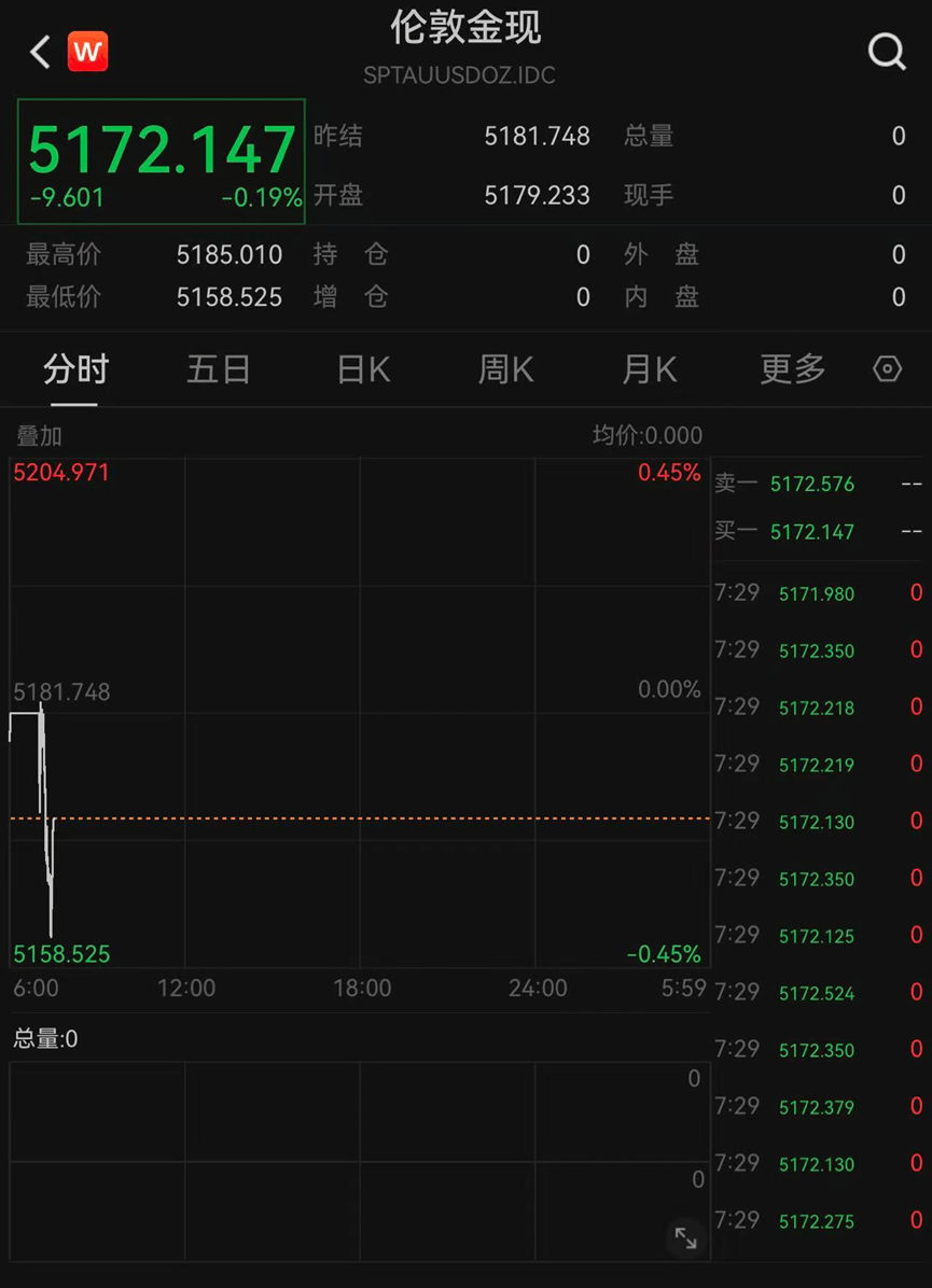 昨夜今晨,贵金属市场上演"过山车"行情。北京时间1月28日,现货黄金、白银开盘下挫,其中伦敦金现相继跌破5180美 元/盎司、5170美元/盎司、5160美元/盎司关口;伦敦银现则向下逼近110美元/盎司。而就在前一交易日,伦敦金现刚刚升 破5190美元/盎司,创历史新高,伦敦银现则是单日大涨逾7%。 昨夜今晨,贵金属市场上演"过山车"行情。北京时间1月28日,现货黄金、白银开盘下挫,其中伦敦金现相继跌破5180美 元/盎司、5170美元/盎司、5160美元/盎司关口;伦敦银现则向下逼近110美元/盎司。而就在前一交易日,伦敦金现刚刚升 破5190美元/盎司,创历史新高,伦敦银现则是单日大涨逾7%。 | | 伦敦金现 < W | | | Q | | --- | --- | --- | --- | --- | | | SPTAUUSDOZ.IDC | | | | | | 昨结 5181.748 5172.147 | 总量 | | 0 | | | -0.19% 开盘 5179.233 -9.601 | 现手 | | 0 | | | 色 最高价 5185.010 持 0 | 外 盘 | | 0 | | | 最低价 ...