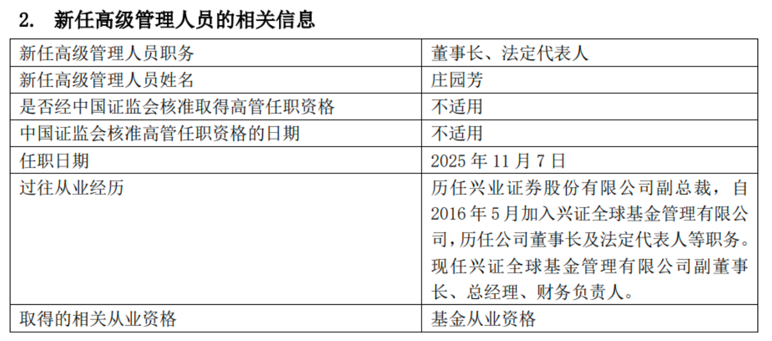 凤凰网财经讯 11月7日,兴证全球基金发布公告称,公司原总经理庄园芳升任董事长,公司原副总经理陈锦泉担任公司总经理、财务负责人一职。 | 新任高级管理人员职务 | 董事长、法定イ | | --- | --- | | 新任高级管理人员姓名 | 庄园芳 | | 是否经中国证监会核准取得高管任职资格 | 不适用 | | 中国证监会核准高管任职资格的日期 | 不适用 | | 任职日期 | 2025 年 11 月 7 | | 过往从业经历 | 历任兴业证券 | | | 2016年5月加 | | | 司,历任公司董 | | | 现任兴证全球 | | | 长、总经理、贝 | | 取得的相关从业资格 | 基金从业资格 | 公开履历显示,庄园芳是一位资深的资管老将,拥有超过33年从业经验。1992年,她加入兴业证券,2005年升任兴业证券副总裁,分管自营投资、研究、机 构、固定收益等业务板块。2016年,庄园芳曾出任兴全基金董事长,是该公司的第三任董事长。2017年1月兼任总经理,后转任专职总经理,在2023年公司 董事会换届后担任副董事长、总经理、财务负责人。 2025年6月,公司原董事长杨华辉因任职年龄原因辞任,庄园芳开始 ...