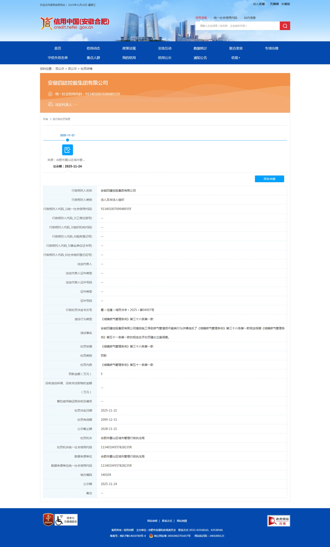 齐鲁晚报·齐鲁壹点记者于信用中国(安徽合肥)双公示栏获悉,11月21日,安徽四建控股集团有限公司(下称"安徽四建控股")收到罚单,处罚类别 是"罚款",处罚机关为合肥市蜀山区城市管理行政执法局。 | 双迎访问值用合肥网站! 2025年11月26日 星期三 | | | | | 加入收藏 无缝磚 长盟版 | | --- | --- | --- | --- | --- | --- | | | | | 信用信息 | 统一社会信用代码 站内信息 调输入企业信息(如名称、企业组织代码) | Q | | 首页 信用动态 | 政策法规 | 交流互动 | 数据统计 | 联合奖惩 | 专项治理 | | 守信失信名单 重点人群 | 我的信用 | 信用公示 | 通知公告 | 信易+ | | | 您的位置: 双公示 > 双公示 > 处罚详情 | | | | | | | 安徽四建控股集团有限公司 | | | | | | | ㊣ 统一社会信用代码:91340100769048935F | | | | | | | 2 法定代表人 :- | | | | | | | 共有 1 条行政处罚值息 | | | | | | | 2025-11-21 | ...