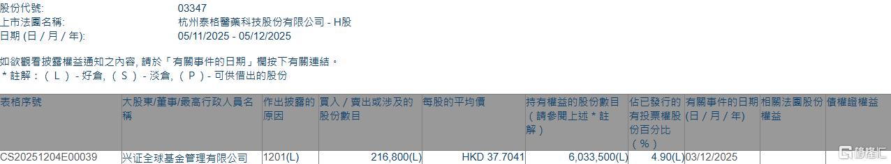 格隆汇12月5日丨根据联交所最新权益披露资料显示,2025年12月3日,泰格医药(03347.HK)遭兴证全球基金管理有限公司在场内以每股均价37.7041港元减 持21.68万股,涉资约817.42万港元。 减持后,兴证全球基金管理有限公司最新持股数目为603.35万股,持股比例由5.08%下降至4.90%。 | 表格序號 | 大股東/董事/最高行政人員名 作出披露的 買入 / 費出或涉及的 每股的平均價 | | | | | 持有權益的股份數目 佔已發行的 有關事件的日期 相 | | --- | --- | --- | --- | --- | --- | --- | | | 原因 | 股份數目 | | | (請參閱上述*註 | 有投票權股 (日 / 月 / 年) 材 | | | | | | | | 份百分比 | | CS20251204E00039 | 兴证全球基金管理有限公司 1201(L) | | 216,800(L) | HKD 37.7041 | 6,033,500(L) | 4.90(L)03/12/2025 | | 股份代號: | 03347 | | --- | --- | | 上市法國名稱: ...