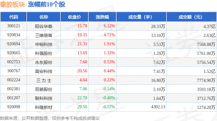 证券之星消息,11月12日橡胶板块较上一交易日下跌0.78%,利通科技领跌。当日上证指数报收于 4000.14,下跌0.07%。深证成指报收于13240.62,下跌0.36%。橡胶板块个股涨跌见下表: | 代码 | 名称 | 收盘价 | 涨跌幅 | 成交量(手) | 成交额(元) | | --- | --- | --- | --- | --- | --- | | 300121 | 阳谷华泰 | 15.78 | 6.12% | 28.33万 | 4.37亿 | | 920834 | 三维装备 | 19.35 | 4.71% | 13.10万 | 2.63亿 | | 920694 | 中裕科技 | 21.33 | 1.91% | 3.53万 | 7568.88万 | | 920665 | 科强股份 | 13.69 | 1.33% | 1.29万 | 1761.00万 | | 002753 | 永东股份 | 7.60 | 0.53% | 7.62万 | 5756.54万 | | 300767 | 震安科技 | 20.56 | 0.44% | 7.41万 | 1.52亿 | | 002224 | 三力士 | 4.64 ...