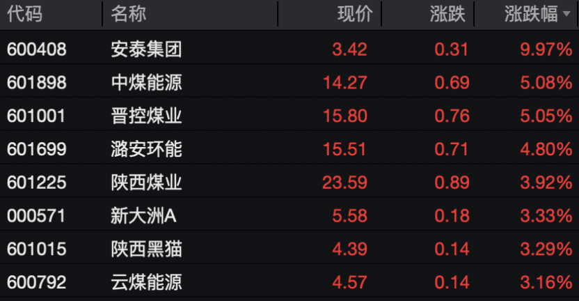 沪指翻红。 A股市场今天(11月3日)上午整体低位震荡,临近上午收盘,上证指数成功翻红。 概念板块方面,煤炭股今天上午大幅上涨,成为A股市场和港股市场主要亮点之一,其中港股飞尚无烟煤领涨,盘中涨幅一度超过180%。此 外,核能核电概念表现强势,多股开盘即涨停,消息面上,我国核能科技领域取得新突破。 沪指翻红 A股市场今天上午整体低位震荡,盘中一度近3000只个股下跌。上证指数盘中一度跌近0.5%,但临近上午收盘成功翻红;创业板指盘中一度 跌超2%,截至午间收盘,跌幅收窄至1.37%。 主要行业板块和赛道方面,若按照申万一级行业划分,煤炭板块领涨,板块盘中涨幅一度超过3%。安泰集团(600408)涨停,晋控煤业 (601001)、中煤能源(601898)、潞安环能(601699)、陕西煤业(601225)、陕西黑猫(601015)、云煤能源(600792)等跟涨。 | 代码 | 名称 | 现价 | 涨跌 | 涨跌幅 ▼ | | --- | --- | --- | --- | --- | | 600408 | 安泰集团 | 3.42 | 0.31 | 9.97% | | 601898 | 中煤能源 | 14.27 ...