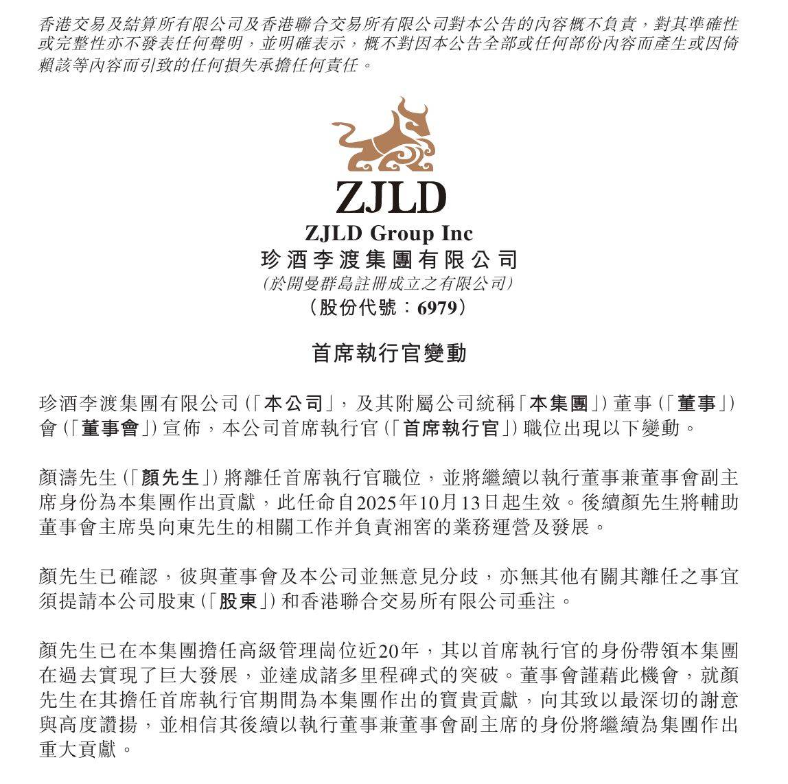 图片来源:征探君 10月13日,珍酒李渡发布公告称,颜涛将离任首席执行官职位,但仍将继续担任执行董事兼董事会副主席,辅助董事会主席吴向东的相关工作并负责湘窖 的业务运营及发展。汤向阳将接任首席执行官一职,负责集团的整体管理及旗下子公司珍酒及李渡的业务运营及发展。 资料显示,颜涛在珍酒李渡担任高管近20年,2024年以1538.8万元的年薪成为白酒行业"最贵CEO"。新任CEO汤向阳也是珍酒李渡的老将,其在1989年便 进入珍酒李渡工作,并在2014年开始担任江西李渡酒业有限公司总经理,2023年4月出任珍酒李渡集团副总裁。汤向阳在中国酒业拥有多项权威专业资 格,包括被认证为中国酒业大国工匠、中国白酒特邀国家评委及高级酿酒师。 相比颜涛的高薪,汤向阳的薪酬"降低"不少。根据聘用函,汤向阳任期三年,年薪及酌情花红合共每年人民币500万元。 在更换CEO背后,珍酒李渡正面临着业绩下滑的压力。2024年,珍酒李渡收入70.7亿元,同比增长0.5%;公司权益股东应占净利润13.24亿元,同比减少 43.1%。2025年上半年,珍酒李渡收入24.97亿元,同比减少39.6%;公司权益股东应占利润5.74亿元,同比减少23 ...