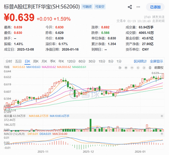 公开资料显示,标普A股红利ETF华宝(562060)及其联接基金(A类501029、C类005125)被动跟踪 标普中国A股红利机会指数,2005年至2025年末,标普A股红利全收益指数的累计收益率高达 2780.43%,年化收益率17.82%,作为市场稀缺的具备"红利+小盘+行业分散"特征的进攻型红利产品, 借道增配红利资产作为资产压舱石,或可使组合更加攻守兼备。 1月19日早盘,三大指数继续进攻,石化、燃气、机械等传统高股息红利板块协同走强。岱美股份、常 宝股份、九丰能源、海容冷链份等高股息、低估值热门股轮番上攻,"进攻型红利"标的——标普A红利 ETF华宝(562060)高开高走,截至发稿场内价格劲涨1.59%创历史新高且持续溢价,实时成交额突破 4000万元。 数据来源:沪深交易所,截至2026.1.19,10点20分 值得注意的是,管近期科技成长主线走强,资金对红利资产的配置热情依然不减。截至2026年1月16 日,标普A股红利ETF华宝(562060)已连续5日揽金3730万元;拉长时间看,近10个交易日中有9日净 流入,合计吸金逾2.1亿元,最新规模突破28亿元,创历史新高。 数据来源:沪深交易 ...