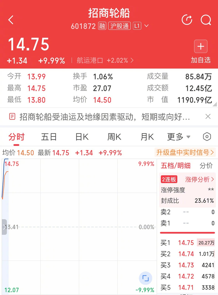 | 招商轮船 C Q | 601872 融 沪股通 L1 × | | | | | --- | --- | --- | --- | --- | | 14.75 + | | | | | | +1.34 +9.99% 航运港口 +2.02% > 加自选 | | | | | | 今开 13.99 | 换手 1.06% | 成交量 | 85.84万 | | | 最高 14.75 | 市盈 27.07 | 成交额 | 12.45亿 | | | 最低 13.80 1190.99亿 | 均价 14.50 | 市 值 | | | | 目 | | | | | | 分时 周K 月K 更多 ▼ 五日 | | | | (0) | | 升级盘中实时信号 > 均价 14.50 最新 14.75 +1.34 +9.99% | | | | | | 14.75 五档/明细 分价 2连板 | | 9.99% | 涨停分析 > | | | 涨停强度 | | | | ** | | 封成比 13.41 | | 0.00% | | 23.61% | | 季2 | | | | 0 | | ゴリ | | | | 0 | | 买1 | | | 14.75 20 ...