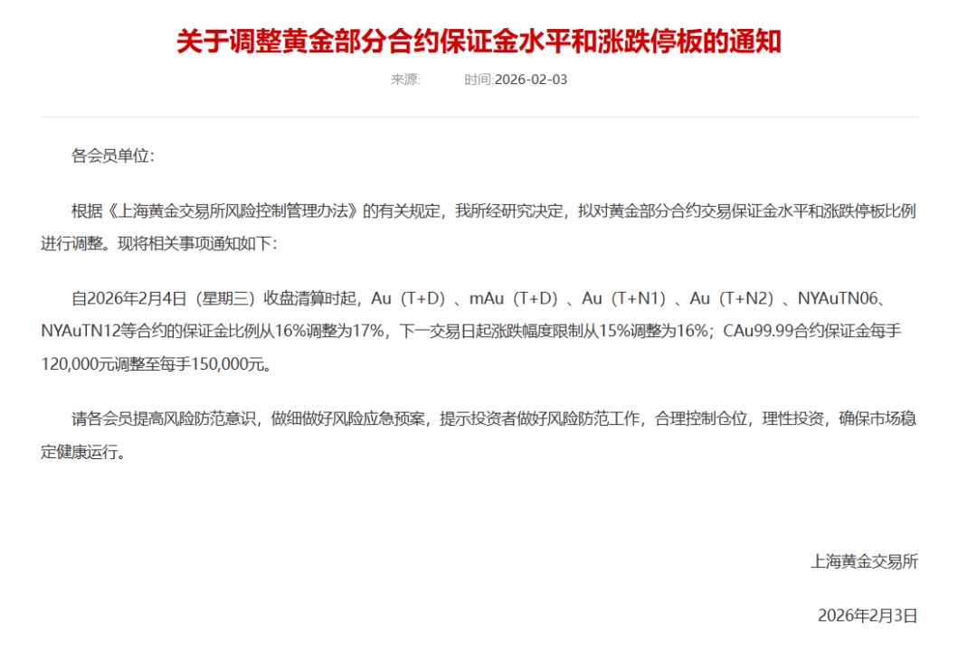自2026年2月4日(星期三)收盘清算时起,Au(T+D)、mAu(T+D)、Au(T+N1)、Au (T+N2)、NYAuTN06、NYAuTN12等合约的保证金比例从16%调整为17%,下一交易日起涨跌幅度限 制从15%调整为16%;CAu99.99合约保证金每手120,000元调整至每手150,000元。 上海黄金交易所发布通知称,拟对黄金部分合约交易保证金水平和涨跌停板比例进行调整。现将相关事 项通知如下: ...