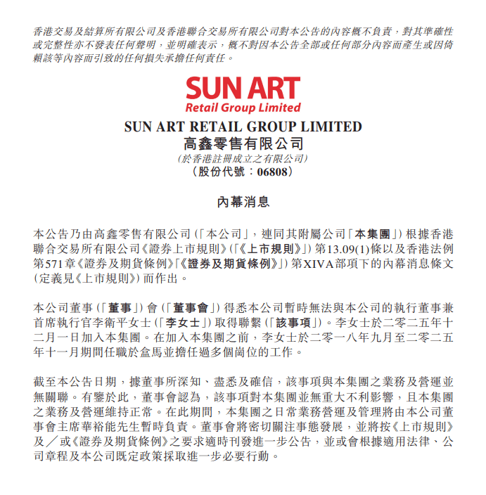 2月4日,大润发母公司高鑫零售在港交所发布公告:公司董事会得悉本公司暂时无法与本公司的执行董 事兼首席执行官李卫平取得联系。 截至本公告日期,据董事所深知、尽悉及确信,该事项与本集团之业务及营运并无关联。董事会认为, 该事项对本集团并无重大不利影响,且本集团之业务及营运维持正常。 公告显示,李女士于2025年12月1日加入该集团。在加入该集团之前,她于2018年9月至2025年11月期间 任职于盒马并担任多个岗位的工作。 据公开资料显示,高鑫零售是拥有大卖场及多渠道电商业务的零售商。集团以"大润发"、"大润发 Super"、"M会员店"品牌经营大卖场、中型超市以及会员店业务。截至2025年9月30日,该集团在全国 29个省市自治区内205个城市共拥有462家大卖场、32家中型超市及七家会员店。 来源 南方都市报 ...