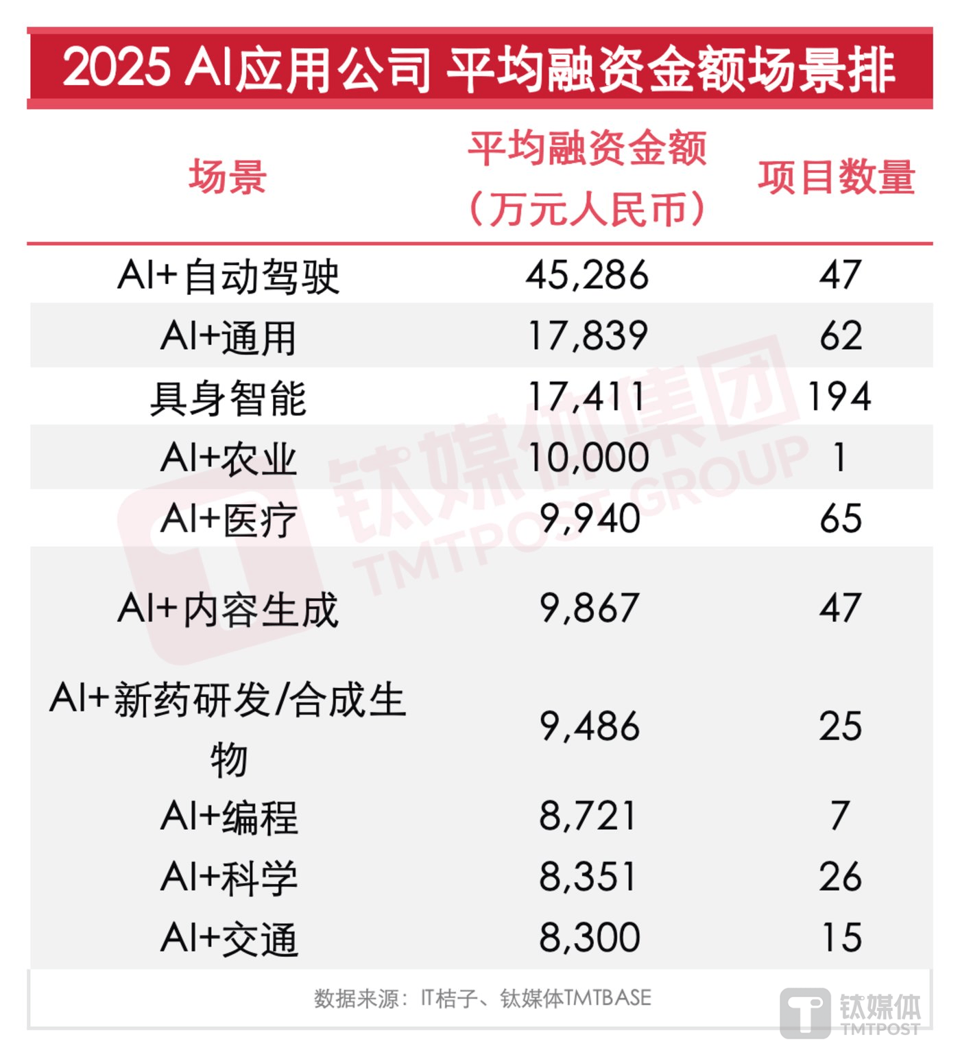 钛媒体App 1月5日消息,2025年,中国一级市场达成了一个昂贵的共识:"AI 应用元年"。据IT桔子、钛媒体TMTBASE数据显示,2025年截至12月,标签包 含AI应用且拿到新融资的公司总数为930家,融资总金额高达1070.7亿元(人民币)。这意味着,在2025年的每一天,都有2.6家公司拿到融资,平均每小时 有1200万资金进场。 | 场景 | 平均融资金额 | | --- | --- | | | (万元人民币) | | Al+自动驾驶 | 45,286 | | Al+通用 | 17,839 | | 具身智能 | 17,411 | | Al+农业 | 10,000 | | Al+医疗 | 9,940 | | Al+内容生成 | 9,867 | | Al+新药研发/合成生 | 9,486 | | 物 | | | Al+编程 | 8,721 | | Al+科学 | 8,351 | | Al+交通 | 8,300 | 数据来源: IT桔子、钛媒体TMTBASE 从资金集中度来看,TOP 3场景(具身智能、自动驾驶、通用)的融资总金额占比,超过总融资金额的一半,达51.6%。其中,具身智能赛道以337.7 ...
