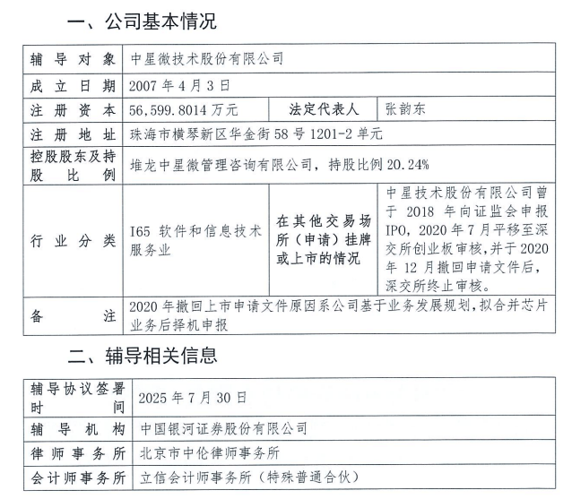 | 辅导协议签署 | | 2025 年 7 月 30 日 | | --- | --- | --- | | 时 | 间 | | | 辅 导 机 构 中国银河证券股份有限公司 | | | | 律师 事 务 所 北京市中伦律师事务所 | | | | 会计师事务所 立信会计师事务所(特殊普通合伙) | | | | 公司基本情况 | | --- | | 辅 导 对象 | | | 中星徽技术股份有限公司 | | --- | --- | --- | --- | | 成 立 日 | | 期 | 2007年4月3日 | | 注 册 | 资 | 本 | 法定代表人 张韵东 56.599.8014 万元 | | 注 册 地 址 | | | 珠海市横琴新区华金街 58号 1201-2 阜元 | | 控股股东及持 | | 例 | 堆龙中星微管理咨询有限公司,持股比例20.24% | | 股 比 | | | 中星技术股份有限公司 品 于 2018 年向证监会申报 | | 行业分 | | 炭 | 在其他交易场 I65 软件和信息技术 所(申请)挂牌 服务业 或上市的情况 | | | | | IP0. 2020年7月半移生深 | | | | ...