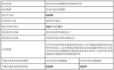 | 定会名称 | 发业中证红利指数型证券投资基金 | | --- | --- | | 歷史演隊 | 其业中证红利指数 | | 质会主代网 | 022290 | | 基金运作方式 | 契約型开放式 | | 质金合同生效目 | 2025年5月29日 | | 基金管理人名称 | 兴业基金管理有限公司 | | 新金托管人名称 | 中国农业银行股份有限公司 | | | 《中华人民共和国证券投资高金法》、《公开募集团券投资精金运 作管理办法》、《公开募集正券投资基金信息投资管理办法》以及 | | 公园依据 | 《关业中通红利指数据证券投资基金基金合同、《关业申请赶集 | | | 指数型证券投资基金招标设明书 | | 下属分级基金的基金简称 | 其业中证红利指数A 其业中证红利指数C | | 下属分级基金的交易代码 | 022290 022291 | | 基金募集申请获中国证监会注册的文号 | | 证监许可【2024】1302号 | | | | --- | --- | --- | --- | --- | | 成令意实测网 | | ( 2025年3月17日起 ¥ 2025年5月 27日止 | | | | 酸资机构名称 | | ...