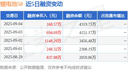 证券之星消息,9月4日,锂电池50(159840)融资买入1747.91万元,融资偿还1579.35万元,融资净买 入168.57万元,融资余额4319.73万元,近3个交易日已连续净买入累计2011.55万元。 小知识 融券方面,当日无融券交易。 融资融券余额4319.73万元,较昨日上涨4.06%。 | 交易日 | 两融余额(元) | 余额变动(元) | 变动幅度 | | --- | --- | --- | --- | | 2025-09-04 | 4319.73万 | 168.57万 | 4.06% | | 2025-09-03 | 4151.17万 | 694.69万 | 20.10% | | 2025-09-02 | 3456.48万 | 1148.29万 | 49.75% | | 2025-09-01 | 2308.19万 | 248.32万 | 12.06% | | 2025-08-29 | 2059.86万 | 837.88万 | 68.57% | | 交易日 | 融资净买入(元) | 融资余额(元) | 占流通市值比 | | --- | --- | --- | --- | | 2025-09 ...