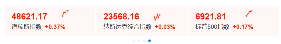 Market Performance - On December 24, the U.S. stock market saw a slight increase before the Christmas holiday, with all three major indices achieving gains for the fifth consecutive trading day, and the S&P 500 index closing at a record high [1] - The Dow Jones Industrial Average rose by 0.60% to close at 48,731.16 points, the S&P 500 increased by 0.32% to 6,932.05 points, and the Nasdaq Composite gained 0.22% to finish at 23,613.31 points [1] Economic Indicators - The U.S. Department of Labor reported that for the week ending December 20, the number of initial jobless claims was 214,000, a decrease of 10,000 from the previous value and below market expectations [1] - The U.S. Department of Commerce revised the third-quarter GDP growth rate to an annualized increase of 4.3%, surpassing market expectations [1] Seasonal Trends - Market observers refer to the seasonal upward trend in the last few trading days of the year and the first few trading days of the new year as the "Santa Claus Rally" [1] Company-Specific News - Nike's stock price saw a significant increase, influenced by Apple CEO Tim Cook's recent purchase of approximately 50,000 shares of Nike [1] - Reports indicated that Nvidia has paused testing of high-end chips using Intel's 18A process technology, which put pressure on Intel's stock price [1]