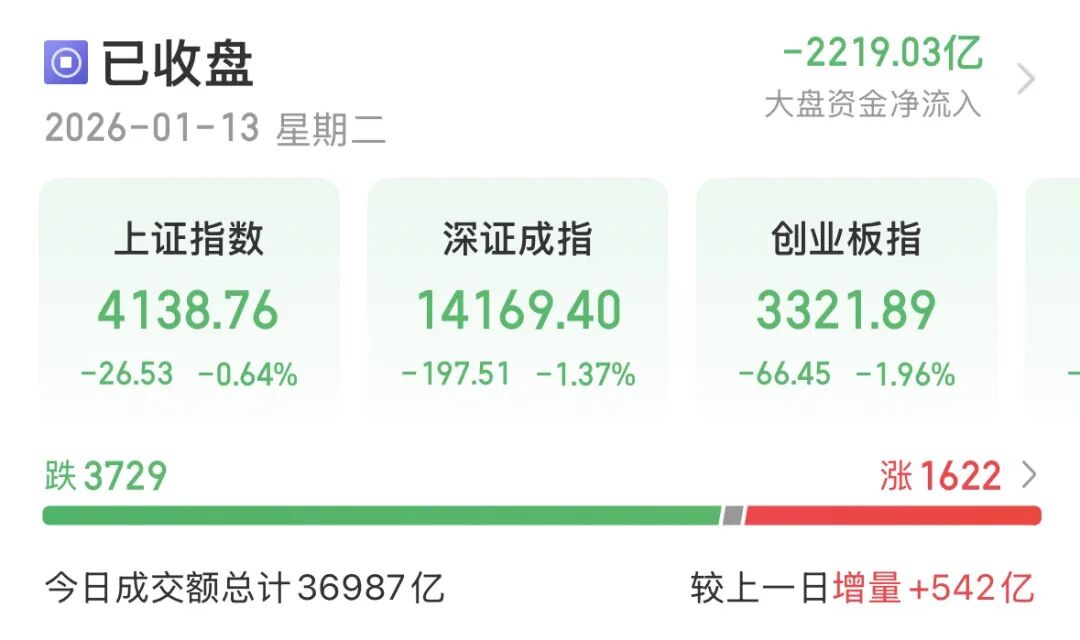 1月13日,A股放量回调,成交额再刷纪录至3.7万亿元。商业航天降温,卫星ETF(交易型开放式指数基金)集体回吐;科技股领跌,创业板指跌近2%; 沪指止步17连阳。 受访人士表示,连续上扬后的技术性调整属正常范畴,并非趋势反转。巨量成交并非资金单边出逃,而是多空博弈加剧、筹码快速换手。预计明日维持震 荡整理,若出现大幅下跌,可适当逢低加仓,切忌盲目追涨。同时需警惕技术迭代不及预期、部分概念股估值透支等风险。 日成交额再创新高 石油石化、银行护盘,沪指微跌0.64%,止步17连阳;国防军工、电子、通信、计算机、机械设备板块回调,创业板指收跌1.96%报3321.89点;深证成指 收跌1.37%。科创50、北证50跌幅均超过2%,沪深300、上证50微跌。 12日天量刚创纪录,13日再放500亿元,成交额升至3.7万亿元。杠杆资金持续升温,截至1月12日,沪深京两融余额增至2.67万亿元。 盘面上,商业航天、大飞机、半导体、电子设备制造、光电子器件、计算机硬件、航空航天装备、通信运营均大跌,但黄金概念、石油天然气、化肥农 药、医疗服务、CRO(合同研究组织)等板块表现不错。 | 东财概念指数 | | | | 东财 ...