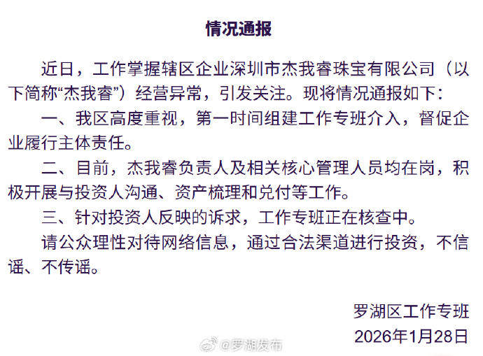 刚刚 罗湖区工作专班发布情况通报 情况通报 近日,工作掌握辖区企业深圳市杰我睿珠宝有限公司(以下简称"杰我睿")经营异常,引发关注。现将 情况通报如下: 一、我区高度重视,第一时间组建工作专班介入,督促企业履行主体责任。 二、目前,杰我睿负责人及相关核心管理人员均在岗,积极开展与投资人沟通、资产梳理和兑付等工 作。 三、针对投资人反映的诉求,工作专班正在核查中。 请公众理性对待网络信息,通过合法渠道进行投资,不信谣、不传谣。 罗湖区工作专班 2026年1月28日 *有什么想说的,欢迎给我们留言哦* 南方都市报(nddaily)、深圳大件事(nandusz)报道 来源:罗湖Plus ...