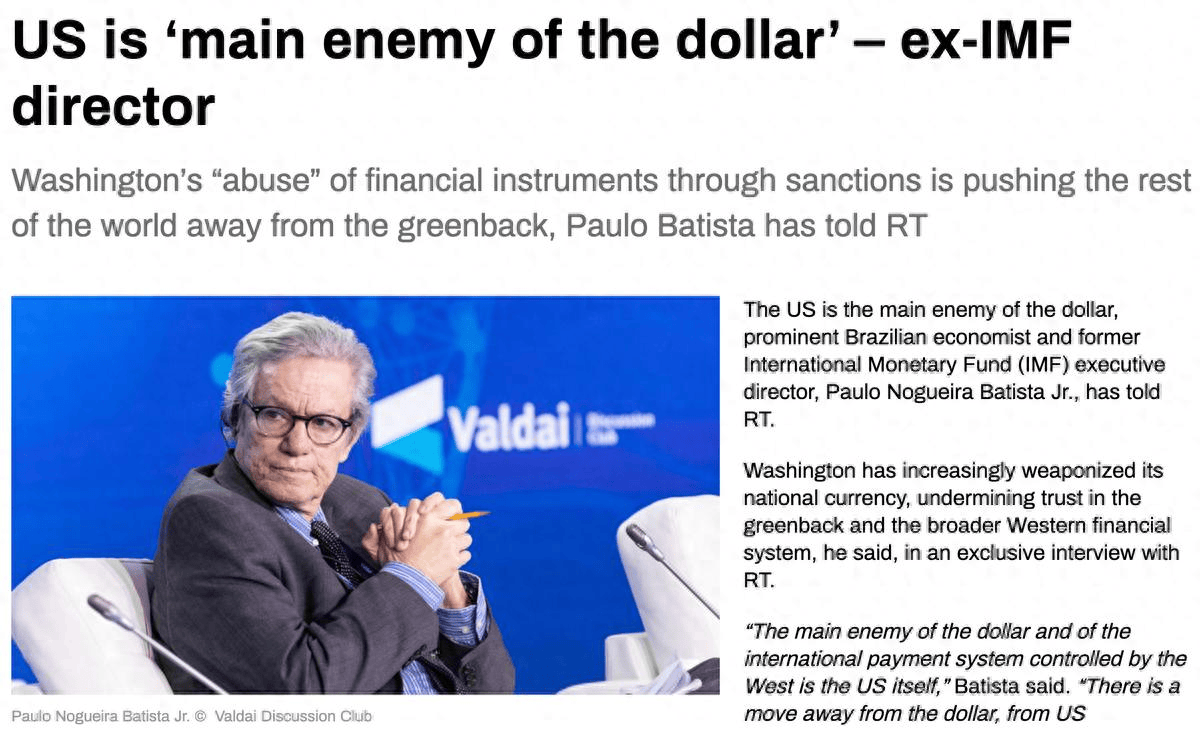 当今世界,关于美元的讨论已跳出经济学家与金融专家的圈层,普通民众也愈发关注这一全球货币霸主的地位动摇。美国政客频频将中国视作"头号敌人", 妄图通过对抗维系金融霸权,却忽视了一个核心事实:真正威胁美元根基的,正是美国自身的短视与越界行为。 在巴蒂斯塔看来,靠恐惧维系的霸权注定脆弱。当SWIFT丧失中立性、沦为地缘政治工具,其在全球金融体系中的合法性便大幅削弱。全球贸易迫切需要一 种不受政治干预、不会随意"断网"的支付保障,而美国显然无法提供这种确定性,各国加速搭建替代支付网络,本质上是对美元信用破产的集体回应。 作为全球核心储备货币,美元的地位建立在"中立性"与"安全性"的隐性承诺之上,而美国早已突破这一底线。2022年,美国联合盟友冻结俄罗斯央行约3000 亿美元海外储备,这不仅是对俄罗斯的精准经济打击,更是对国际金融规则的公然践踏。这笔储备并非私人财富,而是俄罗斯凭借资源出口与劳动创造积累 的合法主权资产,依据传统金融契约精神,央行储备享有绝对主权豁免权,美西方的举动无疑沦为赤裸裸的"国家抢劫",彻底击碎了各国对美元资产安全的 信任。 信任一旦崩塌便难以修复,各国为规避潜在风险,纷纷加速探索美元替代方案, ...