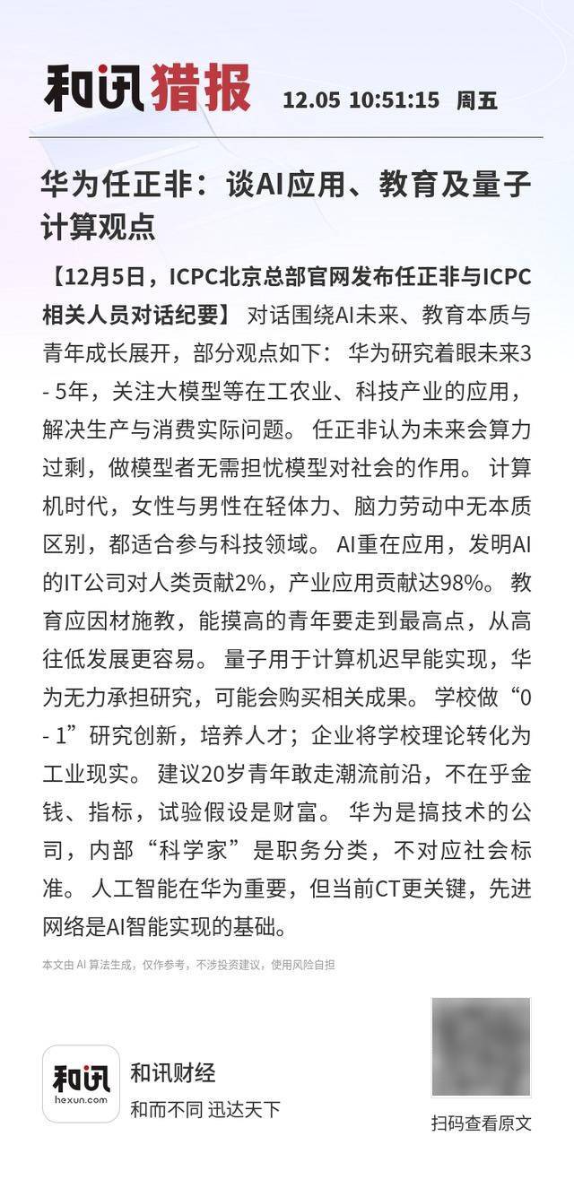 -1 工业现实。建议20岁青年敢走潮流前沿,不在乎金 钱、指标,试验假设是财富。 华为是搞技术的公 司,内部"科学家"是职务分类,不对应社会标 准。人工智能在华为重要,但当前CT更关键,先进 网络是AI智能实现的基础。 本文由 Al 算法生成,仅作参考,不涉投资建议,使用风险自担 和讯财经 和而不同 迅达天下 【12月5日,ICPC北京总部官网发布任正非与ICPC相关人员对话纪要】对话围绕AI未来、教育本质与 青年成长展开,部分观点如下: 华为研究着眼未来3 - 5年,关注大模型等在工农业、科技产业的应 用,解决生产与消费实际问题。 任正非认为未来会算力过剩,做模型者无需担忧模型对社会的作用。 计算机时代,女性与男性在轻体力、脑力劳动中无本质区别,都适合参与科技领域。 AI重在应用,发 明AI的IT公司对人类贡献2%,产业应用贡献达98%。 教育应因材施教,能摸高的青年要走到最高点, 从高往低发展更容易。 量子用于计算机迟早能实现,华为无力承担研究,可能会购买相关成果。 学校 做"0 - 1"研究创新,培养人才;企业将学校理论转化为工业现实。 建议20岁青年敢走潮流前沿,不在乎 金钱、指标,试验假设是财富。 ...