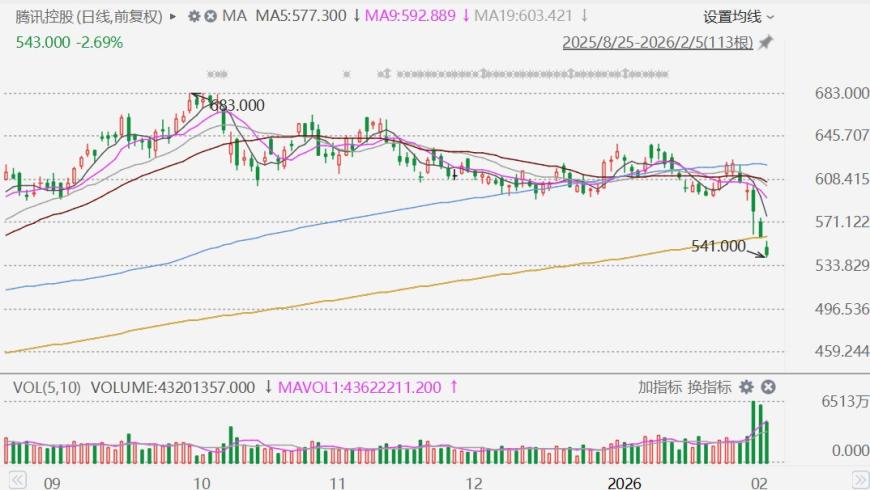 港股频道更多独家策划、专家专栏,免费查阅>> 责任编辑:栎树 2月5日,腾讯(0700.HK)跌3%至541港元,为连续第五日下跌,股价创2025年8月4日以来新低;腾讯年内已累跌近10%,市 值跌破5万亿港元。 分析人士指出,港股市场以腾讯为首的科技股集体下跌,原因是:1)受外围美股科技股近日的持续走弱拖累;2)国内互 联网巨头旗下人工智能(AI)应用相继推出大额红包活动,或引发投资者对竞争加剧的担忧,这也是近期市场的焦点。 ...