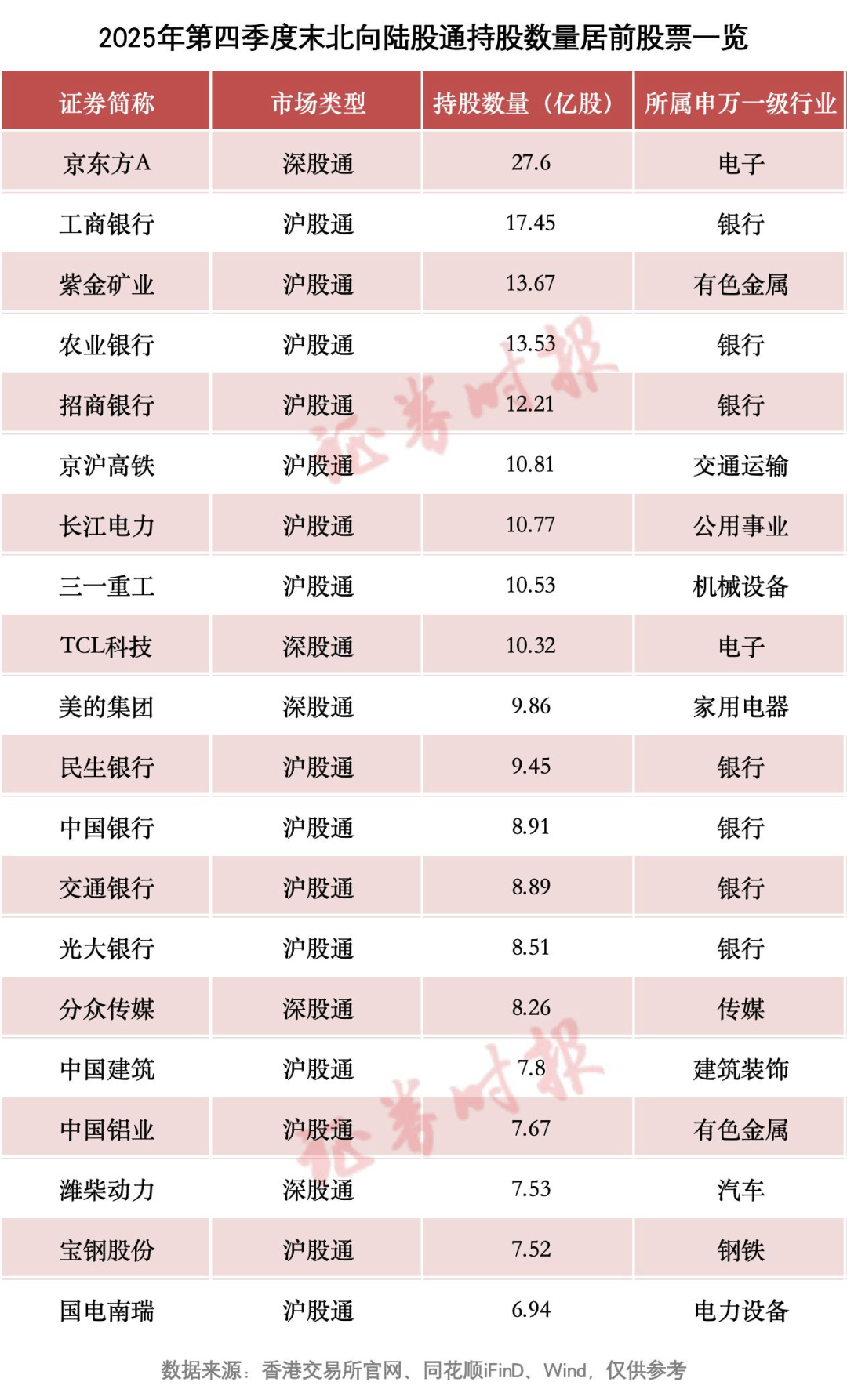 北向陆股通资金2025年第四季度持股情况已经出炉。 近期随着A股市场交投进一步趋向活跃,北向陆股通资金的交投活跃度也有进一步提升,已连续4个交易日超过3000亿元。 北向资金2025年第四季度持股动向出炉 根据香港交易所网站披露的资料,北向陆股通(含沪股通和深股通,下同)2025年第四季度末的持股数据正式披露,北向陆股通资金在2025年第四季度的 持股动向也初步浮出水面。 数据显示,截至2025年四季度末,北向陆股通资金合计持有4014只证券(含股票和ETF),总体持仓情况保持相对稳定。 从具体个股的持股数量上看,截至2025年第四季度末,北向陆股通资金在213只股票上的持股数量超过1亿股,其中在37只股票上的持股数量超过5亿股。 这里面,北向陆股通资金在京东方A、工商银行、紫金矿业、农业银行、招商银行、京沪高铁、长江电力、三一重工、TCL科技等9只股票上的持股数量 甚至超过10亿股。 | 证券简称 | 市场类型 | 持股数量(亿股) | 所属申万一级行业 | | --- | --- | --- | --- | | 京东方A | 深般通 | 27.6 | 电子 | | 工商银行 | 沪股通 | 17.45 | ...