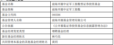 中国经济网北京8月21日讯今日,前海开源基金公告,前海开源中证军工指数增聘林巧亮。 林巧亮2018年6月至2020年6月任长城证券(002939)股份有限公司投资经理助理;2020年6月加盟前海 开源基金管理有限公司,现任公司基金经理。 前海开源中证军工指数A成立于2014年5月27日,前海开源中证军工指数C成立于2015年11月30日,截至 2025年8月20日,其今年来收益率为16.89%、16.63%,成立来收益率为88.20%、-6.38%,累计净值为 1.8820元、1.9070元。 | 基金名称 | 前海开源中证军工指数型证券投资基金 | | --- | --- | | 基金简称 | 前海开源中证军工指数 | | 基金主代码 | 000596 | | 基金管理人名称 | 前海开源基金管理有限公司 | | 公告依据 | 《公开募集证券投资基金信息披露管理办法》 | | 基金经理变更类型 | 增聘基金经理 | | 新任基金经理姓名 | 林巧亮 | | 共同管理本基金的其他基金经理姓名 | 黄明 | ...