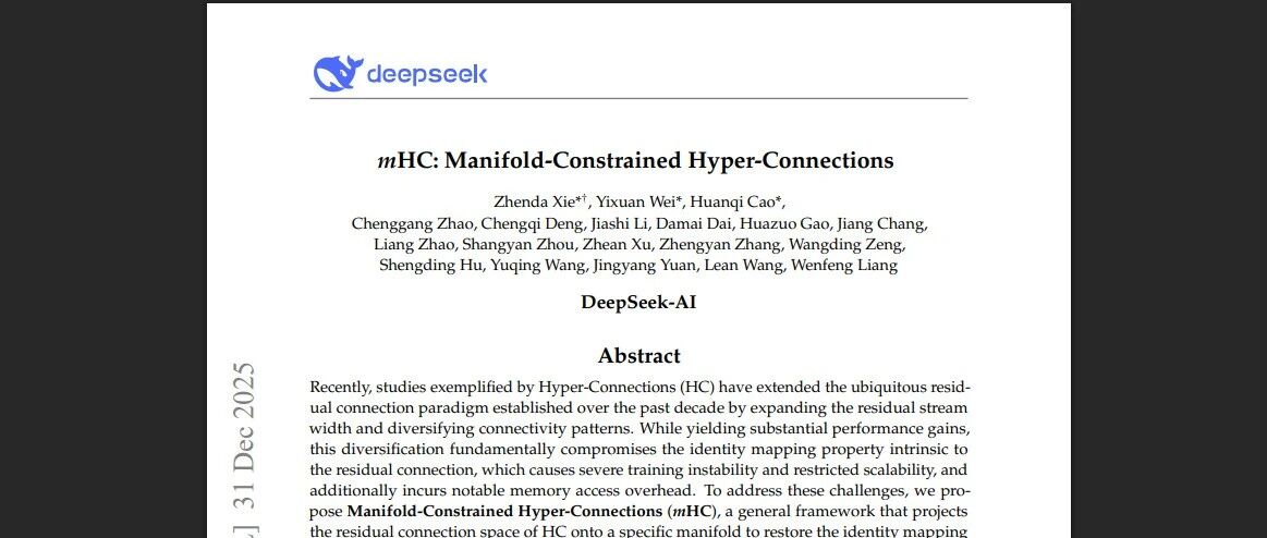 2026年新年第一天,DeepSeek又开卷了。 发了他们新年的第一篇论文。 《 mHC: Manifold-Constrained Hyper-Connections 》 感觉是DeepSeek-V4的铺垫,当然一些小道消息,不保真,我也不懂,我只是拍脑袋预测一下,有问题别找我。 就是V4,大概在1月中下旬或者1月底,然后呢,有多模态输入,没有多模态输出。 就酱,回到论文。 这篇论文我是说实话,有点过于硬核了。 但同时,传递出来的信息量和对AI界的改变,又是巨大的。 在给自己放了一天假,然后啃了一天以后(这玩意比我想象的难啃多了。。。)我还是想,用最通俗易懂最有意思的方式,来跟你聊聊,这篇论文的有 趣之处,以及,是如何对现在的生态进行一些新的输入的。 当然也给我自己叠个甲,我不是算法出身,我只是读完以后觉得很棒想分享给大家看,我对这篇论文的理解和乱七八糟的各种名词解释,都是我自己民 科瞎JB自学的,部分措辞也有为了能让大家更好理解而做的部分简化,如果有我理解的错误或者事实性错误的地方,欢迎大佬们在评论区指正讨论,感 谢。 话不多说,我们,正是开始。 在最开始之前,我想先问大家一个问题,就是大家认为,一个要处 ...