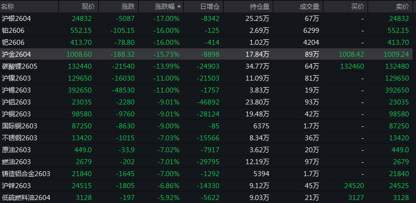 | # 沪银2604 | 24832 -17.00% | 67.40万 | | --- | --- | --- | | 停 ag2604 国 | | | | # 沪金2604 | 1005.40 -16.00% | 87.15万 | | (au2604 国 | | | | # £2606 le pd2606 国 | 413.70 -16.00% | 4176 | | # #2606 | 552.15 -16.00% | 6235 | | 停 pt2606 国 | | | 工业金属方面,沪锡期货早早跌停,跌幅11%。铜、铝、镍、铸造铝合金期货午后跌幅扩大并触及跌 停,沪镍期货跌幅11%,铜、铝期货跌幅9%,铸造铝合金期货跌幅7%。此外,新能源金属碳酸锂期货 盘中触及跌停,跌幅14%。 | 碳酸锂2605 | 133360 -13.39% | | 59.58万 | | --- | --- | --- | --- | | lc2605 = | | | | | # 沪集2603 | 129650 -11.00% | | 80.61万 | | 停 ni2603 国 | | | | | # 清锡2603 | 392650 ...