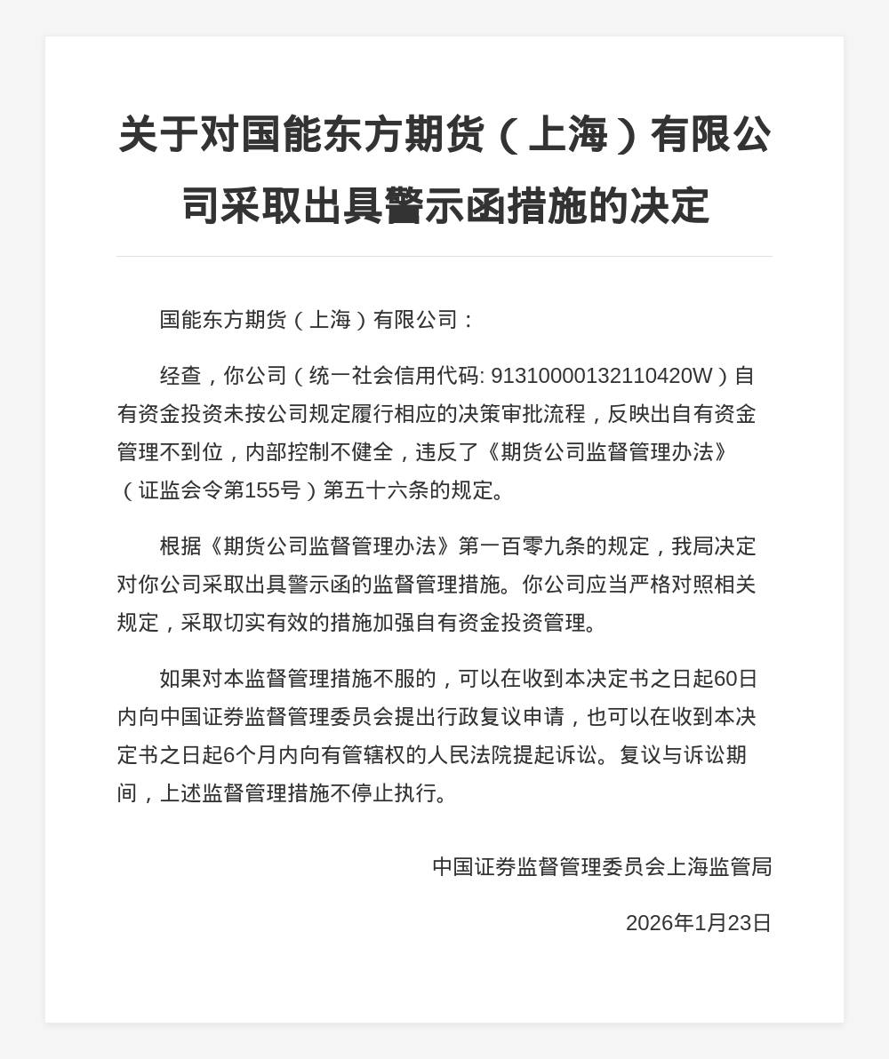国能东方期货被出具警示函,涉自有资金管理不规范等