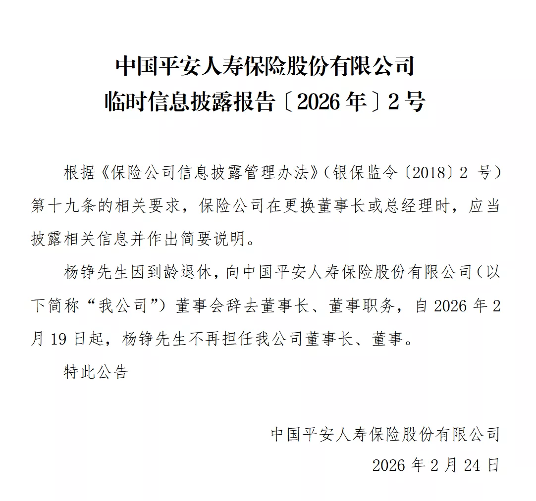 近日,平安人寿发布公告称,杨铮因到龄退休,向该公司董事会辞去董事长、董事职务,自2026年2月19日起,杨铮不再担任公司董事长、董事。 (平安人寿) ...