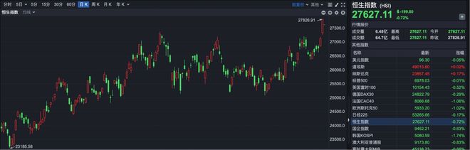 消息面,COMEX黄金期货价格最高突破5626美元/盎司,再创历史新高,2026年开年以来累计涨幅已超 27%。 信达期货认为,展望后市,短期来看由于地缘事件的发展不确定性较大,地缘政治风险对金价的即时刺 激可能在后续出现阶段性降温,金价在快速拉升后不排除出现高位震荡甚至技术性回调。但从更宏观的 视角看,相关不确定性并未消除,特朗普政府对外政策风格激进且行动路径复杂,地缘扰动呈现反复出 现且难以定价的特征,这意味着地缘风险仍将以尾部风险的形式持续存在,为金价提供长期风险溢价支 撑。 截至发稿,恒生指数开盘报27627.11点,下跌199.80点,跌幅0.72%。 | 分割 5日 = 5分 15分 30分 00分 国K 国K 用K #K = | 同意位 · 其他 · ■ / : 恒生指数 (HSt) | | | | | | --- | --- | --- | --- | --- | --- | | 恒生酶数 均线 ▼ | 0000 | 27627.11 | 4-199.80 | | | | | 27826.91 | 行情报险 | | | | | | 27500 0 | 成交量 | 6,48亿 最高 | 2762 ...