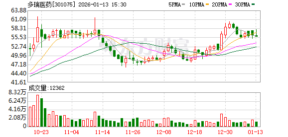 1月13日多瑞医药大宗交易一览 | 成交量(万 | 成交金额(万 | 成交价格 | 相对当日收盘折溢价 | 买方营业 | 卖方营业 | | --- | --- | --- | --- | --- | --- | | 股) | 元) | (元) | (%) | 部 | 部 | | 12.50 | 696.13 | 55.69 | 0.00 | 机构专用 | 机构专用 | 多瑞医药1月13日大宗交易平台出现一笔成交,成交量12.50万股,成交金额696.13万元,大宗交易成交 价为55.69元。该笔交易的买卖双方均为机构专用席位。 证券时报·数据宝统计显示,多瑞医药今日收盘价为55.69元,下跌0.73%,日换手率为1.55%,成交额为 7020.52万元,全天主力资金净流出124.66万元,近5日该股累计下跌1.19%,近5日资金合计净流出 1951.85万元。 两融数据显示,该股最新融资余额为2.02亿元,近5日减少1187.28万元,降幅为5.54%。 据天眼查APP显示,西藏多瑞医药股份有限公司成立于2016年12月22日,注册资本8000万人民币。(数 据宝) (文章来源:证券时报网) ...