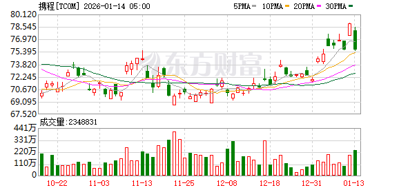 记者丨曾静娇 | 75.680 -3.280 -4.15% | | | | | | | 携程集团 TCOM | | --- | --- | --- | --- | --- | --- | --- | --- | | NASDAQ USD 04:21:14 | | | | | | | | | 港(9961) | 569.500(-6.49%) H/U :- 3.50% | | | रुके | | 5.24% 120日 | - - + 17.23% | | 盘前价 | | 68.720 涨幅额 | -9.20% | 5日 | | -0.56% 250日 | 18.08% | | 涨跌圆前 | | -6.960 盘前量 | 2.15万 | 20日 | | 6.89% 52周高 | 78.99 | | 喜一 | | 75.990 | 100 | 60日 | | 7.81% 52周低 | 51.35 | | 杀一 | | 75.700 | 200 | | 2023 | 2024 | 2025Q3 | | 总量 | 234.88万 换手 | | 0.01% | EbS | 15.19 | 26.10 | 44.29 | ...