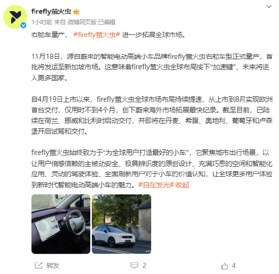 Core Insights - NIO's high-end electric vehicle brand Firefly has officially commenced mass production of its right-hand drive models, with the first batch set to be shipped to Singapore, indicating an acceleration in its global expansion strategy [1] Group 1: Global Expansion - Since its launch on April 19, Firefly has rapidly expanded its global market presence, achieving its first delivery in Europe within less than four months, setting a record for NIO's overseas market expansion [1] - Deliveries have already begun in the Netherlands, Norway, and Belgium, with upcoming test drives and deliveries planned in Denmark, Greece, Austria, Portugal, and Luxembourg [1]