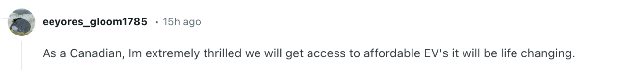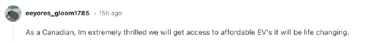 环球网消息,加拿大将给予中国电动汽车每年4.9万辆的配额,配额内享受6.1%的最惠国关税待遇,配额数 量将按一定比例逐年增长。加拿大总理卡尼16日晚在出席中国-加拿大贸易与投资晚宴时表示,相关安排将 为加拿大人民带来更多利好。 针对这一决定,美国有些人疑似出现"酸葡萄"心理:据英国路透社报道,美国交通部长肖恩·达菲16日 称,"我认为他们(加拿大)回头看这个决定时,肯定会后悔把中国汽车引入他们的市场"。美国贸易代表 格里尔在采访时说,加拿大的相关决定"存在问题"。不过值得一提的是,美国总统特朗普的看法与以上两 人不同:在被问及加拿大与中国就深化经贸合作达成广泛共识时,特朗普表示加拿大应该这么做,"这是 件好事"。 加拿大真的会"后悔"吗?国外论坛reddit关于这一新闻的讨论区,目前讨论量已过千。 有自称是加拿大人的网友表示不仅不后悔,还很"激动":"作为一名加拿大人,我为我们将能买到能负担得 起的电动汽车而非常激动,这将改变我们的生活。"↓ "美国消费者会非常羡慕加拿大人,因为他们能以美国消费者一半的价格买到符合加拿大安全标准的电动 汽车。"↓ 还有网友提到了美国福特汽车首席执行官:"福特CEO就拥有并驾驶 ...