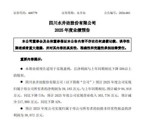 随着水井坊年报预告的发出,有业内人士直言,白酒股年报"第二只黑天鹅"出现了。此前,口子窖预计2025年净利润预降50%-60%。水井坊再刷2025财年 酒企净利降幅新低。 当下,水井坊的多项财报数据的"骤降",引发行业关注。公开数据显示,2022年至2024年,水井坊的营收和净利润均保持低个位数增长,出现业绩滞涨信 号。到了2025年,水井坊业绩直接"崩盘"。其中,第三季度营收8.50亿元,同比下降58.91%;归母净利润2.21亿元,同比下降75.01%。水井坊下跌加速。 昨日晚间,"川酒六朵金花之一"水井坊发布2025年业绩预告。公告显示,水井坊预计2025年实现营业收入为30.38亿元,同比下降42%,实现归母净利润为 3.92亿元,同比下降71%,扣非后归母净利润3.81亿元,同比下降71%。 或叠加水井坊式微业绩预告,尽管水井坊曾在2025年12月公开否认被收购传闻,但结合川酒集团的到厂考察、帝亚吉欧精简业务的动作走向等消息,水井 坊控股公司、全球烈酒巨头帝亚吉欧意欲出售水井坊的讨论持续升温,水井坊的未来,似乎越发迷雾重重。 01 业绩"跳水" 出清加速 分产品来看,水井坊前三季度高档酒实现收入20 ...