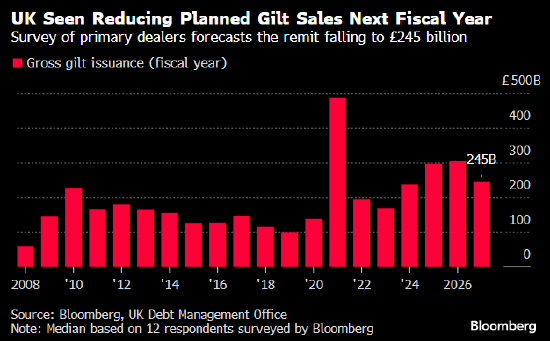 英国料将在未来一年削减国债发行规模,这对担忧该国财政紧张的债券投资者而言实属难得的好消息。 根据媒体对12家一级交易商的调查中值显示,英国政府债券发行机构债务管理办公室料将宣布 2026/2027财年国债总发行额为2450亿英镑(3310亿美元)。 责任编辑:刘明亮 该规模将创三年来新低,较当前财年减少590亿英镑(约20%),有望缓解英国政府短期融资成本压力 —— 该国融资成本目前仍居七国集团之首。 法国巴黎银行经济学家Dani Stoilova表示,"我认为这将使市场在未来几个月保持平稳状态。在经历了疫 情和能源危机冲击后,这更像是回归正常状态。" 债务管理办公室将在英国财政大臣蕾切尔·里夫斯发表春季声明后公布英国国债发行计划。里夫斯将发 布最新的经济预测,但她已暗示政策不会有重大变化。 法国巴黎银行经济学家Dani Stoilova表示,"我认为这将使市场在未来几个月保持平稳状态。在经历了疫 情和能源危机冲击后,这更像是回归正常状态。" 债务管理办公室将在英国财政大臣蕾切尔·里夫斯发表春季声明后公布英国国债发行计划。里夫斯将发 布最新的经济预测,但她已暗示政策不会有重大变化。 责任编辑:刘明亮 英国料将 ...