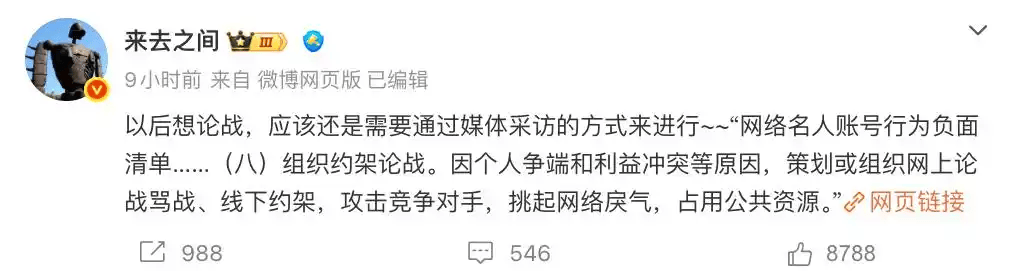 在网络上设置和参与公共议题应始终坚持理性、建设性原则。 1月16日,西贝贾国龙与"网红"罗永浩关于预制菜的网络斗法上演第二回。当天,贾国龙在个人微博号 宣布,当晚10点将对"罗永浩对西贝的重大污蔑诽谤"全面回应。罗永浩也准备迎战。就在各路吃瓜群众 搬出板凳围坐静候时,两人的账号突然被禁言了。 从这个意义而言,任何只愿在网上"开撕"、打死不上法院的网络论战,都是"滥用麦克风"。某些情况 下,甚至有理由怀疑它不是为真理论战,而只是为了制造和消费流量。如果有这种动机和行为,无论背 后是谁,都应该受到广大网民唾弃。 让我们以这次"始乱终弃"的网络论战为戒,一起用好、管好、爱护好网络资源,共建文明、清朗、美好 的网络世界。 (作者系第一财经编辑) 责任编辑:韦子蓉 在网络上设置和参与公共议题应始终坚持理性、建设性原则。 新浪微博CEO回应贾罗之争,相当于解释了禁言的原因。他摘录了一段由中央网信办于去年12月发布的 文件,该文件列出了13条"网络名人账号行为负面清单"。其中第八条为:"组织约架论战。因个人争端 和利益冲突等原因,策划或组织网上论战骂战、线下约架,攻击竞争对手,挑起网络戾气,占用公共资 源。"可见,对贾、罗 ...